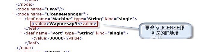 在這兩個文件夾中,都有一個名字叫:b1-local-machine.xml 的文件,用記事本或其它可以編輯XML文件的軟件打開,找到節點:LicenseManager,把里面的登錄機器名改為你License服務器的IP地址,然后保存即可,如下圖所示: