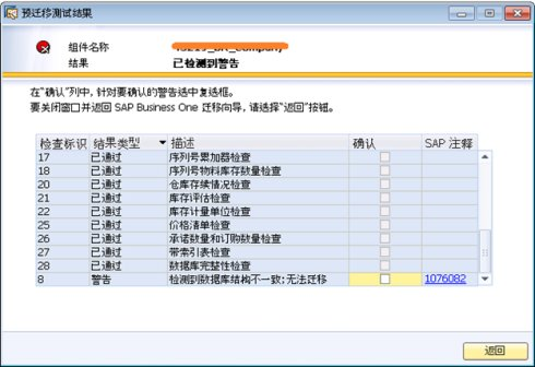 如果檢測(cè)到警告信息,則點(diǎn)擊'詳細(xì)信息'打開(kāi)預(yù)遷移測(cè)試結(jié)果窗口,向?qū)?huì)列出警告的具體描述信息以及SAP注釋: