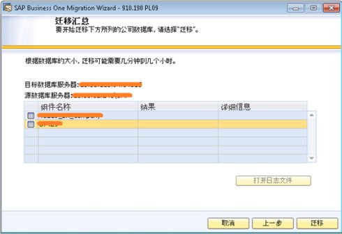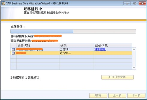 在遷移過(guò)程中,向?qū)?huì)先進(jìn)行數(shù)據(jù)庫(kù)的備份,然后將公司數(shù)據(jù)庫(kù)復(fù)制到SAP HANA中。向?qū)б矔?huì)顯示進(jìn)度條以及遷移結(jié)果。遷移完成后,點(diǎn)擊'打開(kāi)日志文件',可以查看遷移的具體日志信息。點(diǎn)擊'下一步':